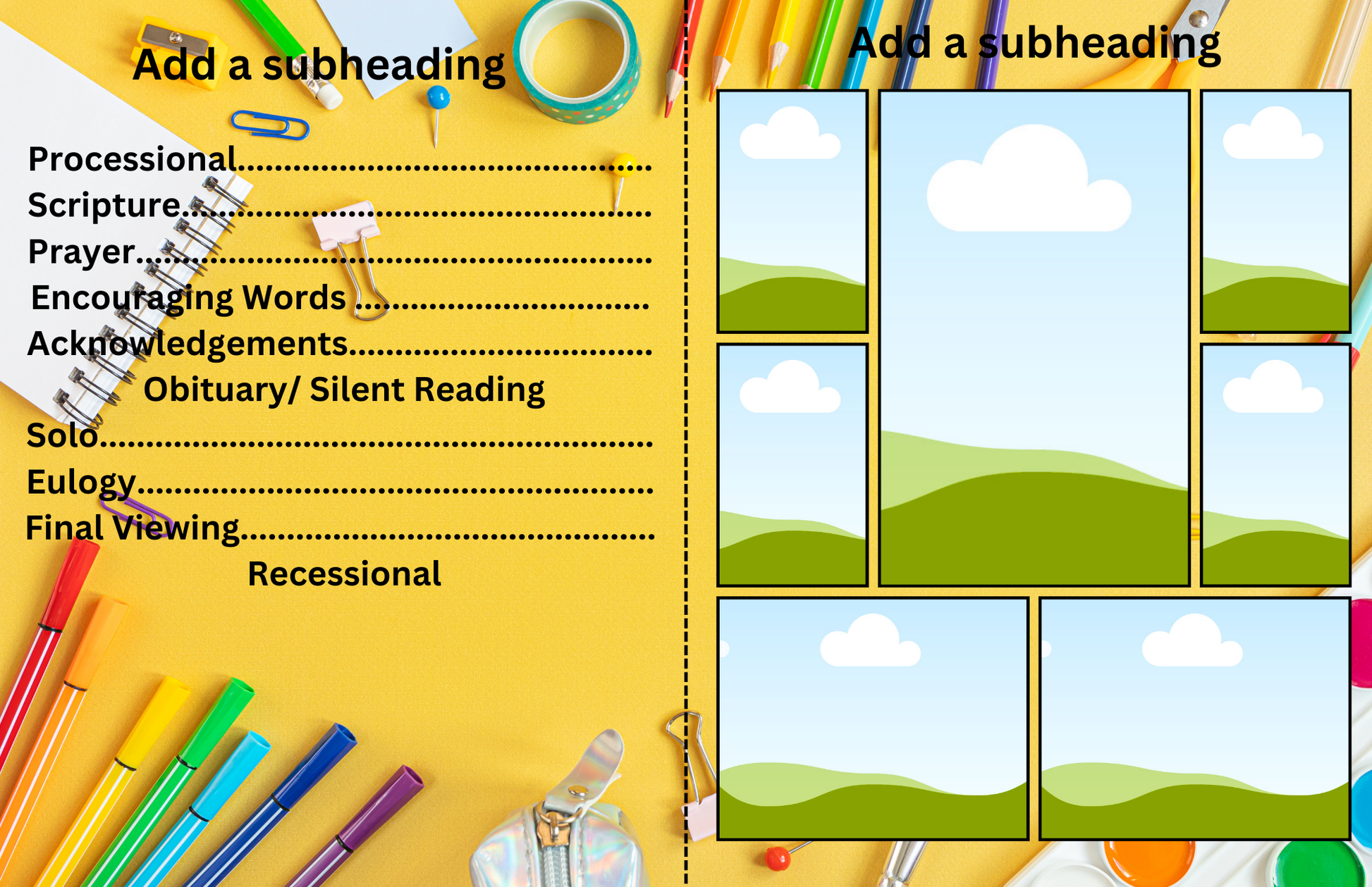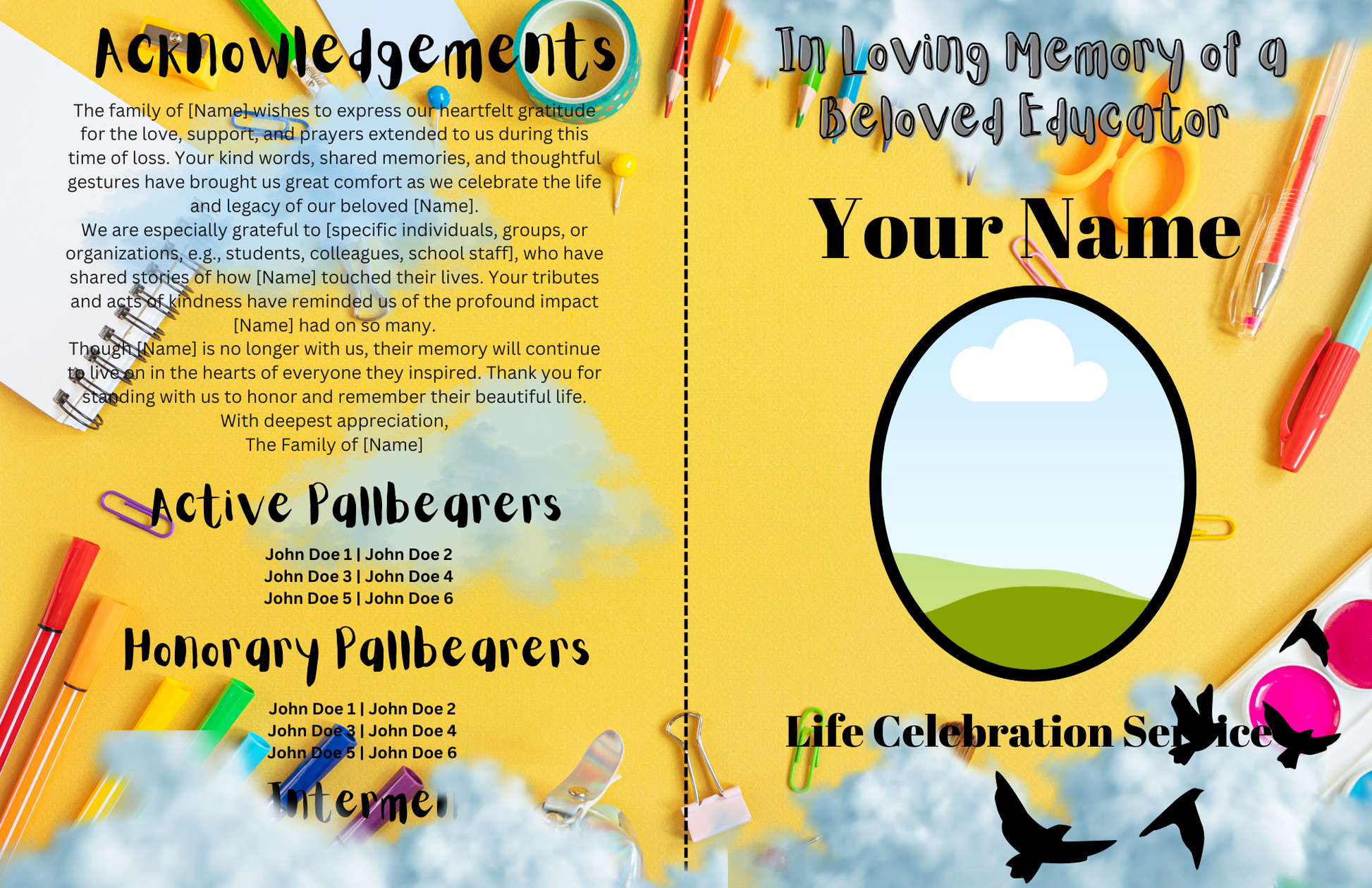This 8-page memorial program features a joyful school-themed layout with symbolic elements like notebooks, pencils, paint, and paperclips. It’s the perfect tribute for someone who shaped minds and hearts both inside and outside the classroom.